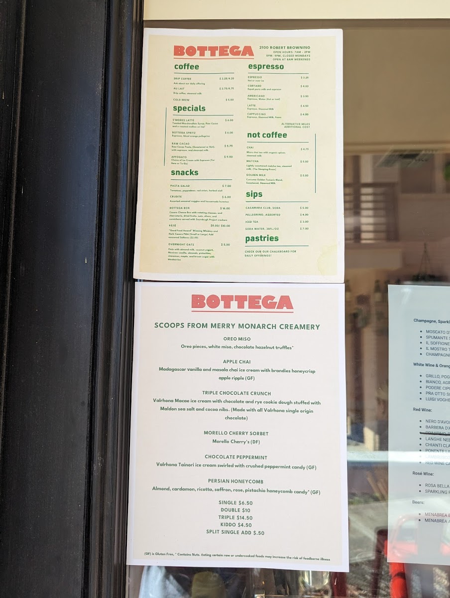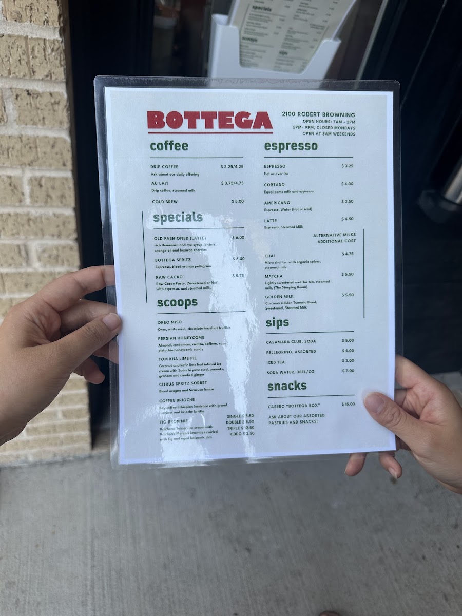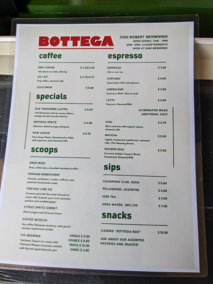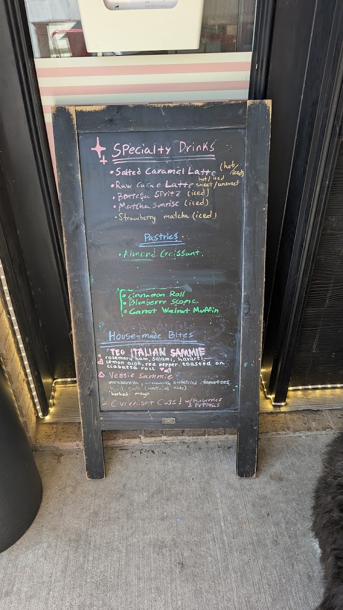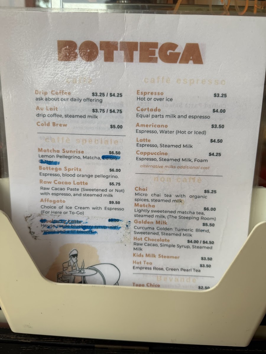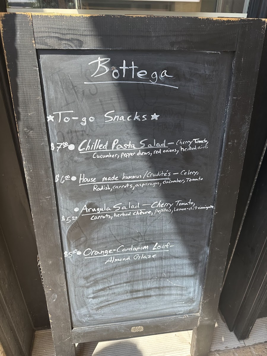 The menu at Bottega offers a range of beverages and light food options, structured to accommodate breakfast, coffee breaks, and light meals. The selection primarily features various coffee and espresso drinks, including drip coffee with daily variations, cold brew, au lait, cappuccino, cortado, and espresso-based options. Non-coffee beverages include golden milk with turmeric, hot chocolate, matcha, chai, and hot tea. For iced and sparkling beverages, the menu includes iced black tea and mineral waters such as Pellegrino and Topo Chico.